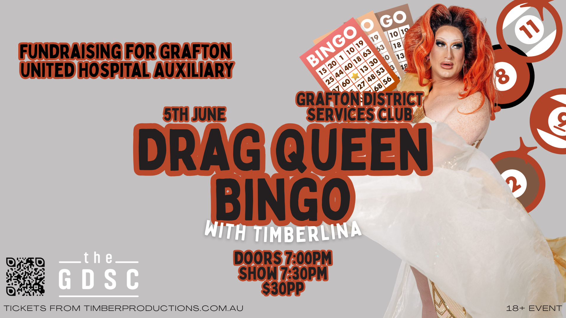 The lady of the night sassily presents… Drag Bingo with Timberlina – Fundraising for Grafton United Hospital Auxiliary 💖